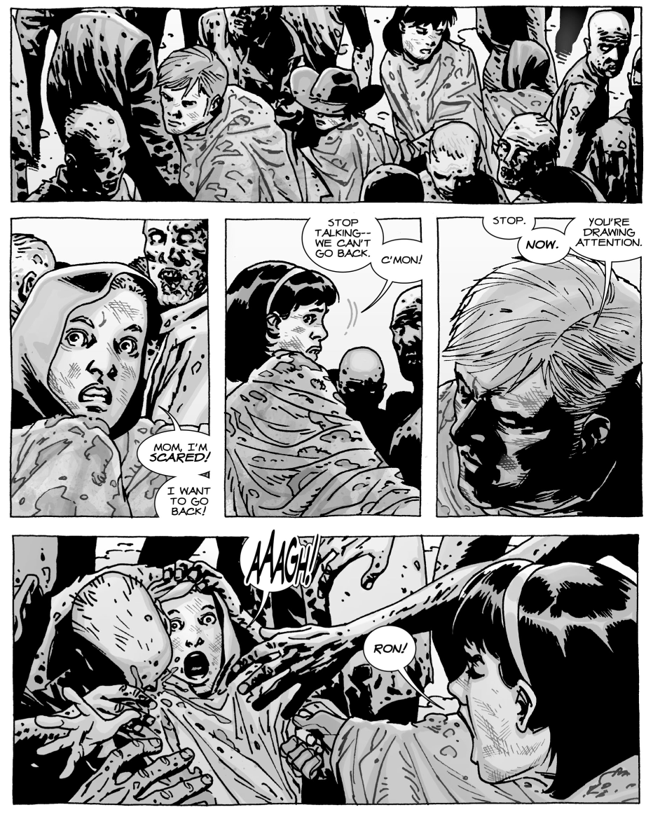 Jednak zanim zacznę krytykować i pluć jadem, to pochwalę twórców za naprawdę kawał dobrej roboty przy kompletowaniu nowej obsady. Szósty sezon to cała chmara nowych bohaterów, począwszy od pionków wymyślonych przez twórców, skończywszy na istotnych, czołowych postaciach z komiksu, które do tej pory odgrywają w nim ważne role. Bardzo podobał mi się też szacunek z jakim podchodzili twórcy do swojego źródła, czyli komiksu Kirkmana. Niektóre kadry wyglądają jak żywcem wyjęte ze stronic jednego z zeszytów „Żywych Trupów”. Zresztą zobaczcie sami…